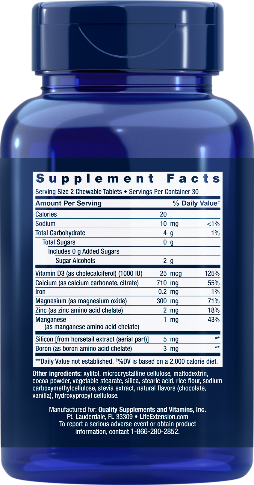 Chocolate chewables with 700 mg of calcium, 25 mcg (1,000 IU) of vitamin D3, plus trace minerals for bone health support.