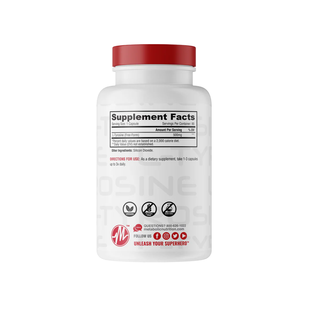 L-Tyrosine is an amino acid that is naturally produce in the body from another amino acid called phenylalanine. L-Tyrosine can also be found in certain foods such as meat, fish, eggs, dairy products, beans, nuts, oats and wheat. L-Tyrosine is a critical amino acid due to its involvement in the production and regulation of Dopamine, Adrenaline, Noradrenaline, Melanin and Thyroid hormones. Because of this, L-Tyrosine has been shown to have medicinal benefits with regards to improving mental performance, alertness, memory enhancement and beneficial with regards to stress, depression and attention/focus issues. Metabolic Nutrition provides a purified, all natural, highly concentrated dosage of L-Tyrosine for maximum effectiveness & absorption....specifically developed for individuals who want to maximize their health and wellness.