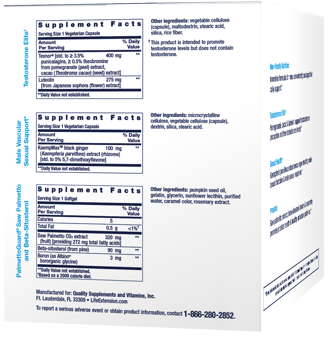 Men need nutrition that’s customized to their needs—that means supporting sexual health, testosterone levels, and prostate and urinary function. Our Men’s Vitality Packs do just that, providing 30 servings of our science-based Male Vascular Sexual Support, Testosterone Elite†, and PalmettoGuard® Saw Palmetto and Beta-Sitosterol formulas in convenient, individual daily-dose packs that are perfect to take on the go.