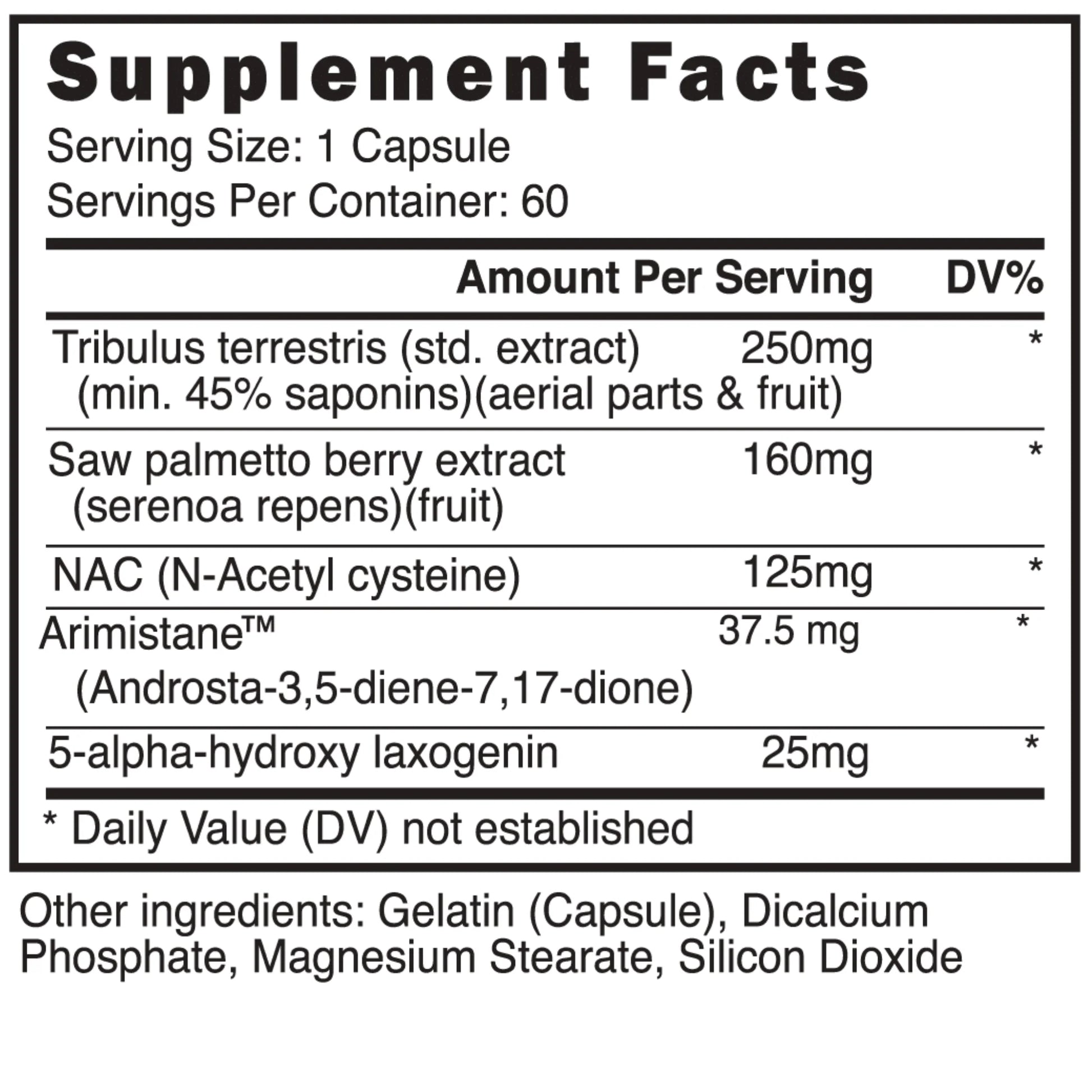 Tribulus Terrestris (250mg) increases production of luteinizing hormone (LH) which supports natural testosterone production. Tribulus also helps reduce stress and cortisol, which is incredibly catabolic and a known testosterone killer.