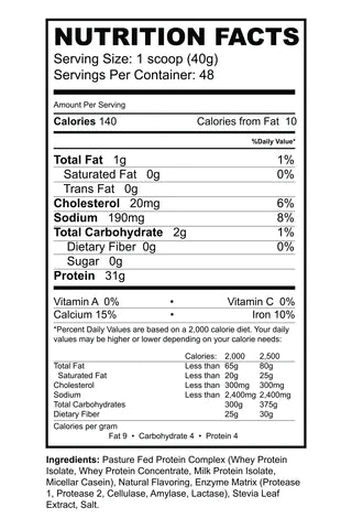 Precision Blend is made with premium pasture fed whey protein complex consisting of whey protein isolate, concentrate and casein for a high protein content with high but slower absorption. Precision Blend protein feeds cells with amino acids at a low level over a longer period to keep you satiated longer and left with more energy throughout the day.